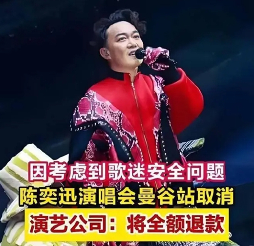 然而,就在大家以为这场风波已经平息的时候,陈奕迅的泰国演唱会却又陷入了另一场风波之中。据悉,原定于近期在泰国举行的陈奕迅演唱会因“王星事件”而被迫取消。这一消息无疑给期待已久的粉丝们带来了不小的打击。